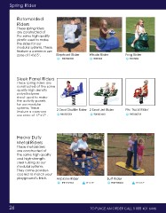 Spring Rider Rotomolded Riders These spring riders are constructed of the same high quality plastic used to make the slides for our modular systems. These feature a common use zone of 14’x15’. Elephant Rider Whale Rider Frog Rider 90018203XX 90018201 90018202 Sleek Panel Riders These spring riders are constructed of the same quality high density polyethelyene sheet used to make the activity panels for our modular systems. These 2 Seat Shuttle Rider 2 Seat Jet Rider Fire Truck Rider feature a common use zone of 17’x17’. 90018315XX 90018316XX 90018307XX Heavy Duty Metal Riders These metal riders are constructed of the same high quality and high-strength steel tubing as our modular systems. They come powder- coated to match your playground’s finish. Airplane Rider Surf Rider TFR17474XX 17’ X 17’ 90019002XX 14’ X 17’ 26 TO PLACE AN ORDER CALL 1-888-401-6446