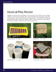 Musical Play Musical Play Rocks! Children of all ages enjoy exploring sound and music. This activity set encourages children to both hear and make music; promoting listening, language, math and science skills, as well as both individual and group play. Choose from five different instruments that allow children to explore rhythm, tone and harmony. These items are sold as portable. In-ground mount kits sold separately. Mini Sound Wave 77126 Upright Piano 77133 Single Post Bongo 77134 Glockenspiel 77131 36 TO PLACE AN ORDER CALL 1-888-401-6446