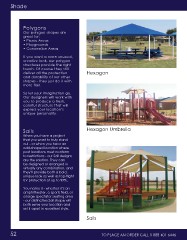 Shade Polygons Our polygon shapes are great for: • Picnic Areas • Playgrounds • Concession Areas If you want a more unusual, creative look, our polygon structures provide the right touch. Of course they still deliver all the protection Hexagon and durability of our other shapes - they just do it with more flair. So let your imagination go. Our designers will work with you to produce a fresh, colorful structure that will express your location’s unique personality. Sails Hexagon Umbrella When you have a project that you want to truly stand out - or when you have an odd-shaped location where post locations must conform to restrictions - our Sail designs are the solution. They can be designed or arranged in virtually any combination, and they’ll provide both a bold, unique look as well as top-flight UV protection of up to 99%. You name it - whether it’s an amphitheater, a sports field, or a large spectator seating area - our distinctive Sail shape will both serve your location and set it apart in excellent style. Sails 52 TO PLACE AN ORDER CALL 1-888-401-6446