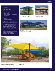 Shade Squares & Rectangles Our square and rectangular shapes are great for: • Picnic Areas • Water Parks and Pool Decks • Playgrounds Picnic Shade Pool Shade • Bleachers • Dugouts • Concession Areas At the core of our shade offerings are our Square and Rectangular designs which deliver remarkably efficient and economical shade protection. They’re available in a wide variety of sizes, heights, colors and fabrics - all of which can be coordinated Parking Shades to meet your location’s individual requirements. Rectangle Shades for Play Areas VISIT US ONLINE at APCPLAY.COM 53