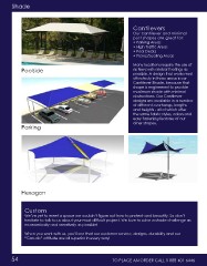 Shade Cantilevers Our cantilever and minimal post shapes are great for: • Parking Areas • High-Traffic Areas • Pool Decks • Picnic/Seating Areas Many locations require the use of Poolside as few posts and/or footings as possible. A design that works most effectively in those areas is our Cantilever Shade, because that shape is engineered to provide maximum shade with minimal obstructions. Our Cantilever designs are available in a number of different overhangs, lengths and heights - all of which offer the same fabric styles, colors and easy-fastening features of our other shapes. Parking Hexagon Custom We’ve yet to meet a space we couldn’t figure out how to protect and beautify. So don’t hesitate to talk to us about your most difficult project. We love to solve a shade challenge as economically and creatively as possible! When you work with us, you’ll see that our customer service, designs, durability and our “Can-do” attitude are all superior in every way! 54 TO PLACE AN ORDER CALL 1-888-401-6446
